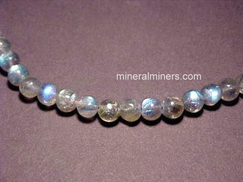 This natural labradorite necklace was hand-crafted from very high-grade quality natural labradorite (also known as spectrolite). The beads in this rare quality labradorite necklace are semi-transparent to transparent with occasional blue, green & gold flashes of beautiful iridescent natural color. The labradorite was hand-ground and polished into round shaped beads which were then drilled and strung in this lovely 18" labradorite necklace with a sterling silver clasp. The photo at left shows a close-up view. See also a full view of this natural labradorite necklace. We have this round bead labradorite necklace available with 5.5mm diameter beads, and also in a much larger 7mm bead diameter size. Please see below to order.